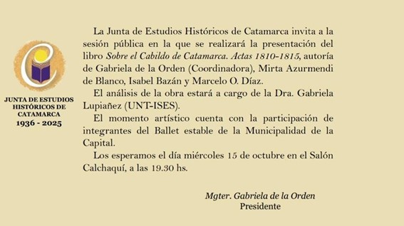 La Junta de Estudios Históricos de Catamarca realizará una sesión pública para la presentación del libro “Sobre el Cabildo de Catamarca. Actas 1810-1815”. El libro fue elaborado por Gabriela de la Orden —quien coordinó el trabajo— junto con Mirta Azurmendi de Blanco, Isabel Bazán y Marcelo O. Díaz. Durante el encuentro, la Dra. Gabriela Lupiáñez, investigadora del Instituto Superior de Estudios Sociales de la Universidad Nacional de Tucumán (UNT-ISES), estará a cargo del análisis de la obra.