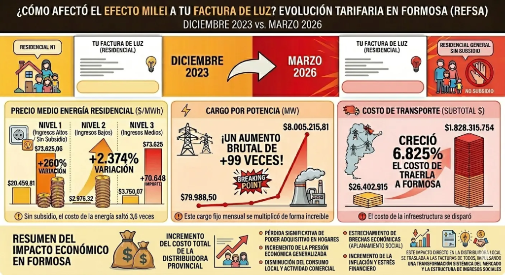 La política energética impulsada por el presidente Javier Milei, basada en la eliminación de subsidios a la luz y el incremento de los precios mayoristas, generó un impacto sin precedentes en todo el país y perjudicó directamente a la economía de los hogares formoseños. Según los datos relevados, los usuarios de ingresos bajos y medios fueron los más castigados por el ajuste y registraron aumentos tarifarios del 2.374% y 1.862%, respectivamente, entre noviembre de 2023 y marzo de 2026.