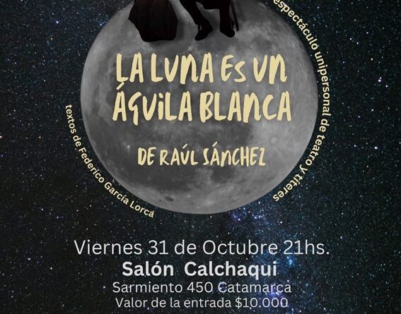 El próximo viernes 31 de octubre, a las 21, se presentará en el Salón Calchaquí la obra “La luna es un águila blanca”, un espectáculo unipersonal del actor, director y dramaturgo Raúl Sánchez. La propuesta, que combina teatro y títeres e incluye textos del poeta español Federico García Lorca, cuenta con la colaboración en canto y voz de Lia Raggio, acordeón de Daniela Bartolomé y en confección de muñecos, Marcelo y Lucas Fernández.
